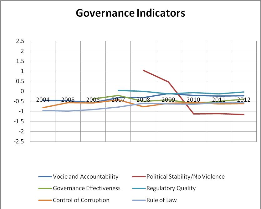 In the case of Kosovo, a publication of the World Bank shows that the evaluation of governance yielded negative results. Good governance is measured with the six indicators above and results rage from -2.5, being the lowest and 2.5 being the highest. The chart above shows that governance in Kosovo in the years between 2004 and 2012 has continuously received negative ratings.